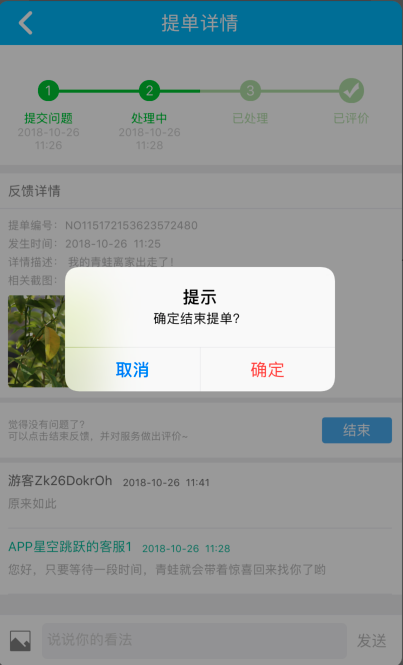玩家如果与客服达成一致,可以点击结束处理工单。