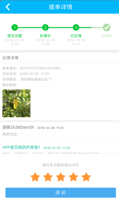 提交->处理中->已处理->已评价四种状态。- 已提交:表示工单已提交至后台,等待客服接单。
