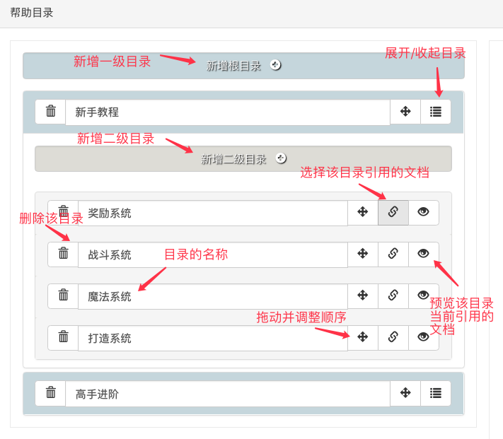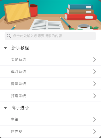 3、帮助目录 # #lfeng/wellplay/能力综述/帮助系统 帮助目录是客户端展示给玩家的帮助文档的组织索引,目前系统仅支持二级目录结构。 开发者可以在控制台中自行创建或维护目录结构。 对应的表现效果如下: 目录名会参与关键字检索。